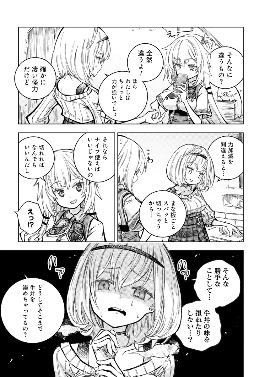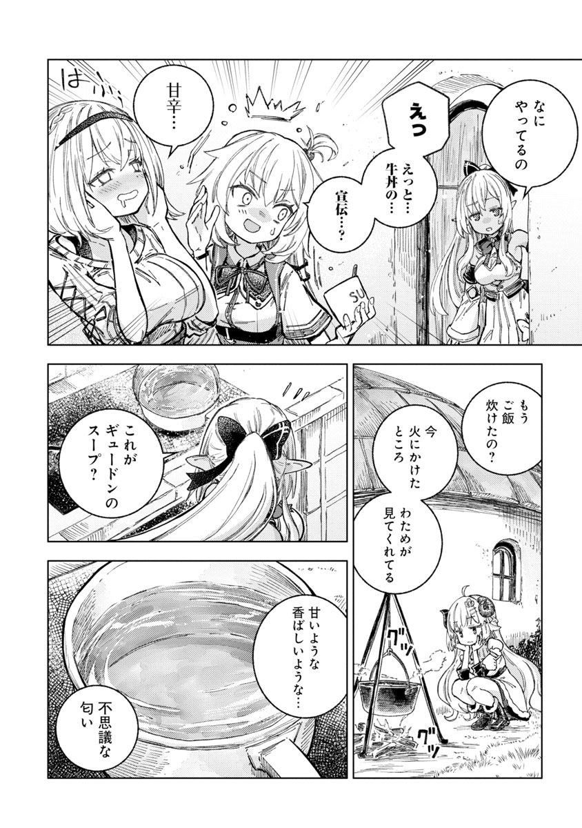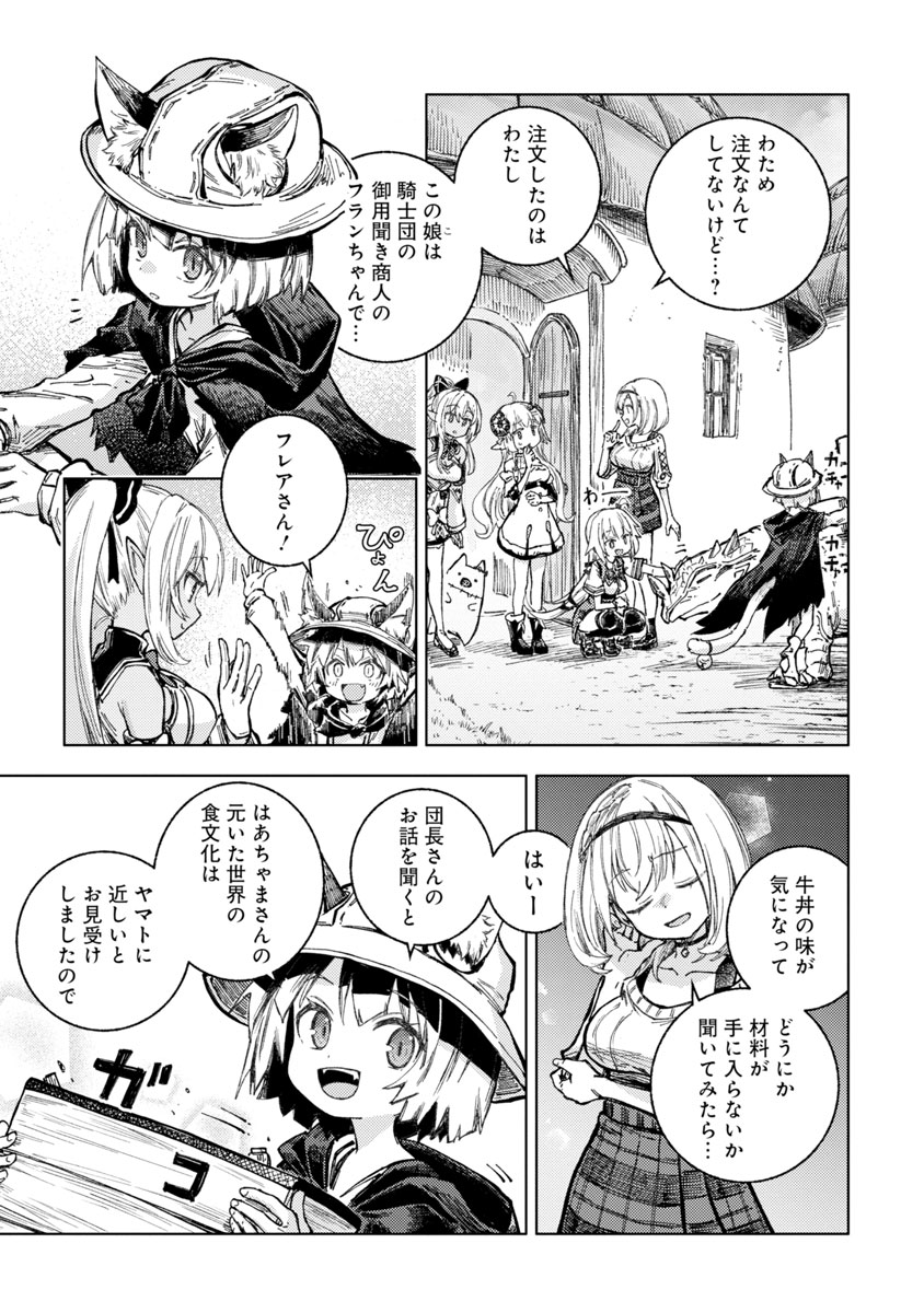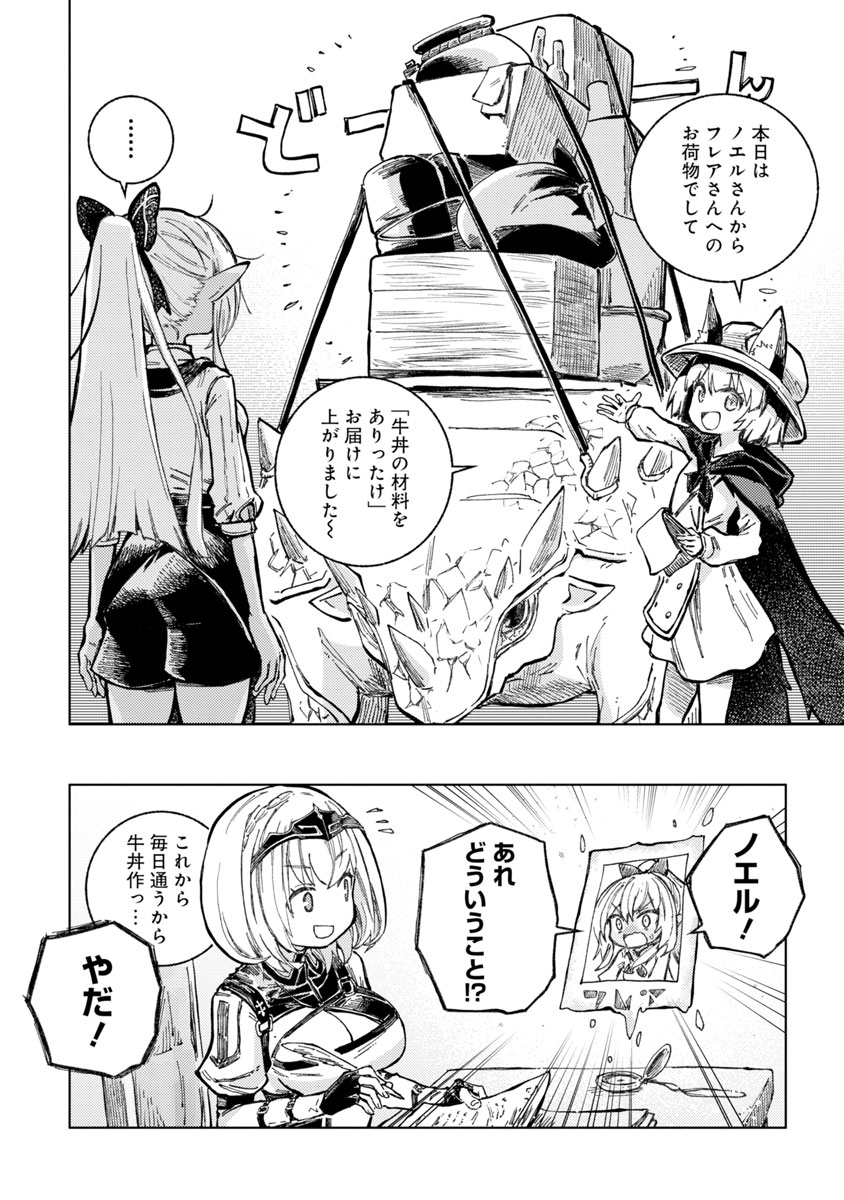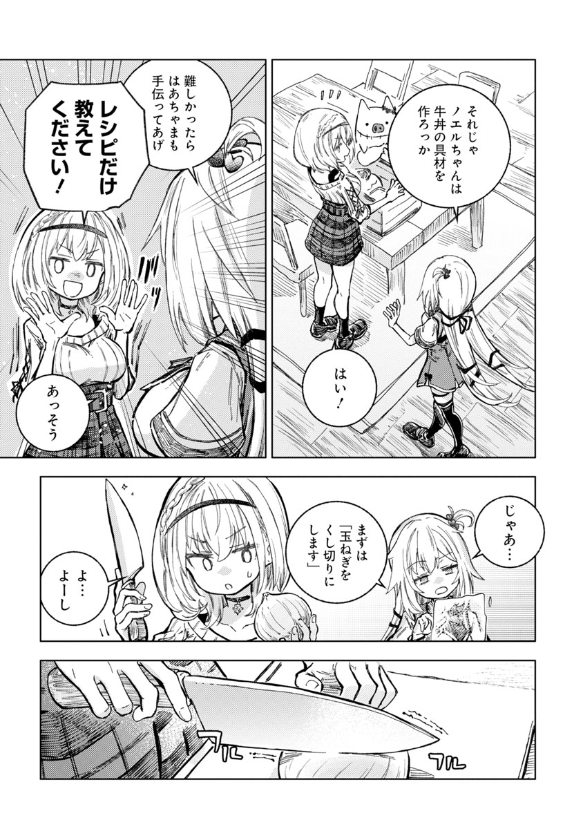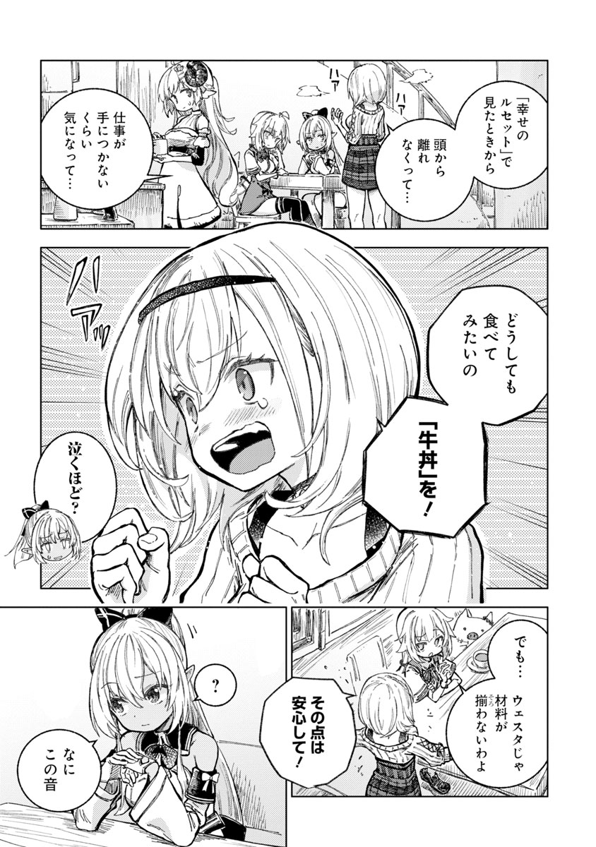 自らの手料理を食べた衝撃で異世界に飛ばされてしまった少女「赤井はあと」と、異世界で羊飼いを営む、頭に角をつけた少女「角巻わため」、人気の喫茶店マチカドカフェの看板娘「不知火フレア」、騎士団の団長「白銀ノエル」