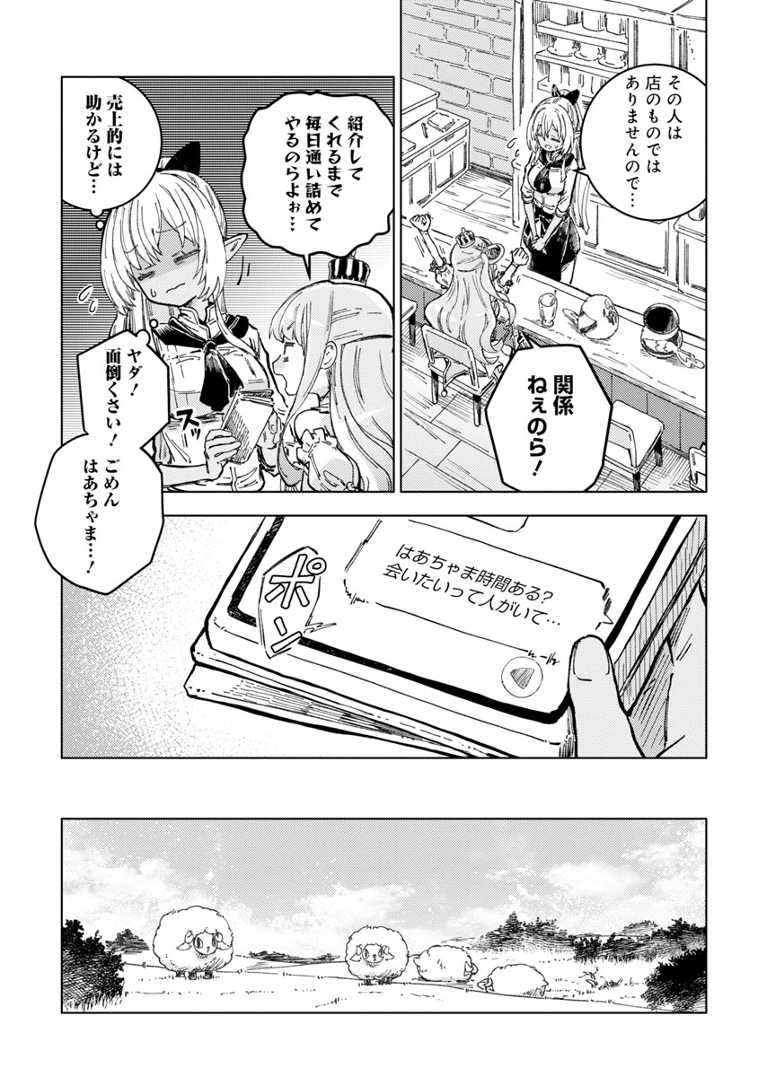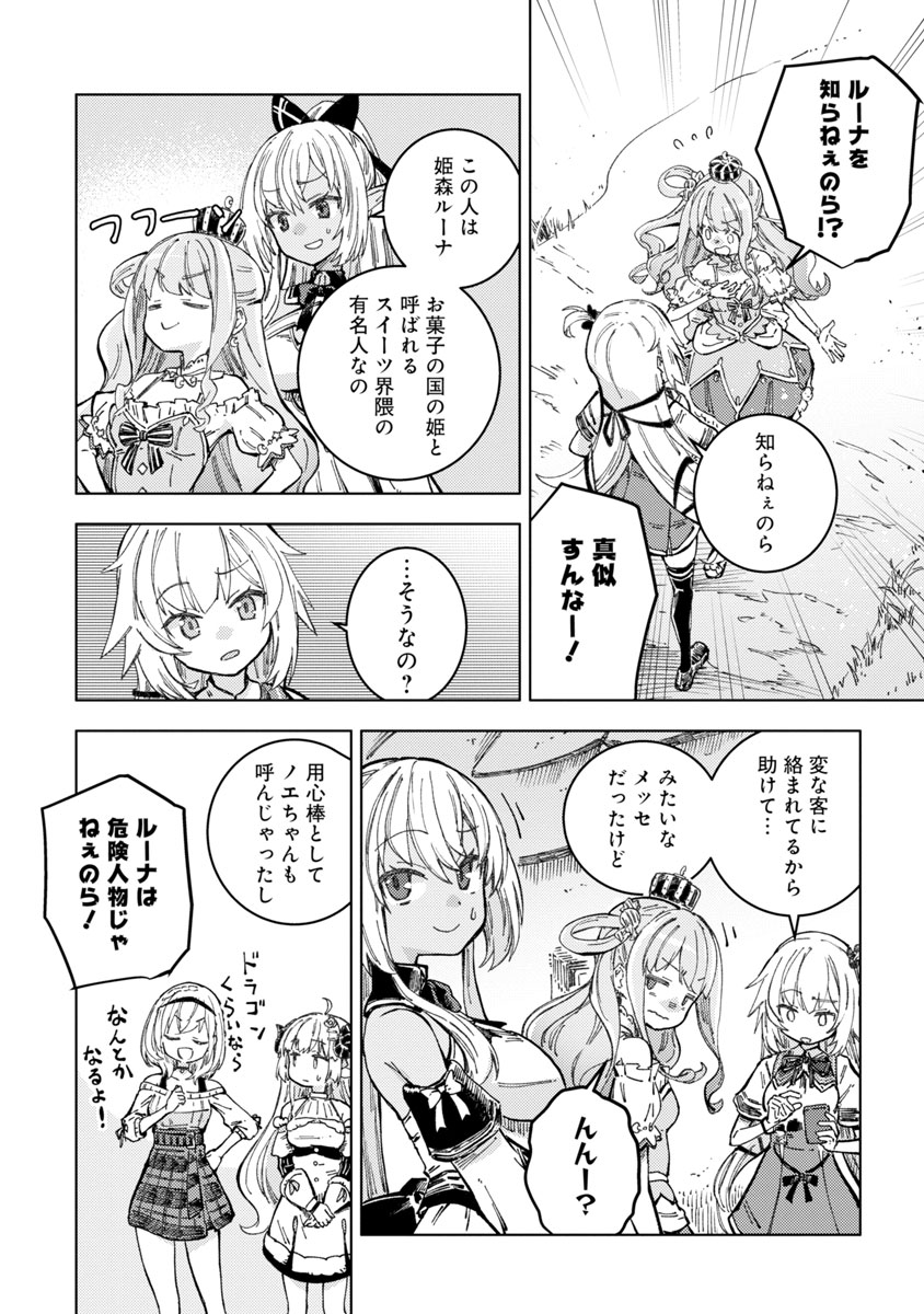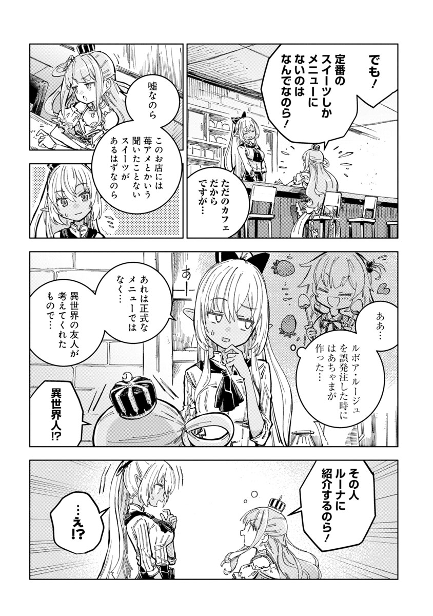 自らの手料理を食べた衝撃で異世界に飛ばされてしまった少女「赤井はあと」と、異世界で羊飼いを営む、頭に角をつけた少女「角巻わため」、人気の喫茶店マチカドカフェの看板娘「不知火フレア」、騎士団の団長「白銀ノエル」