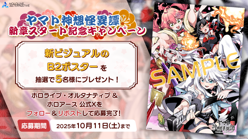 『ヤマト神想怪異譚』新章スタートを記念して、新ビジュアルのB2ポスターが5名様に当たるキャンペーンをホロライブ・オルタナティブ公式Xにて開催します。