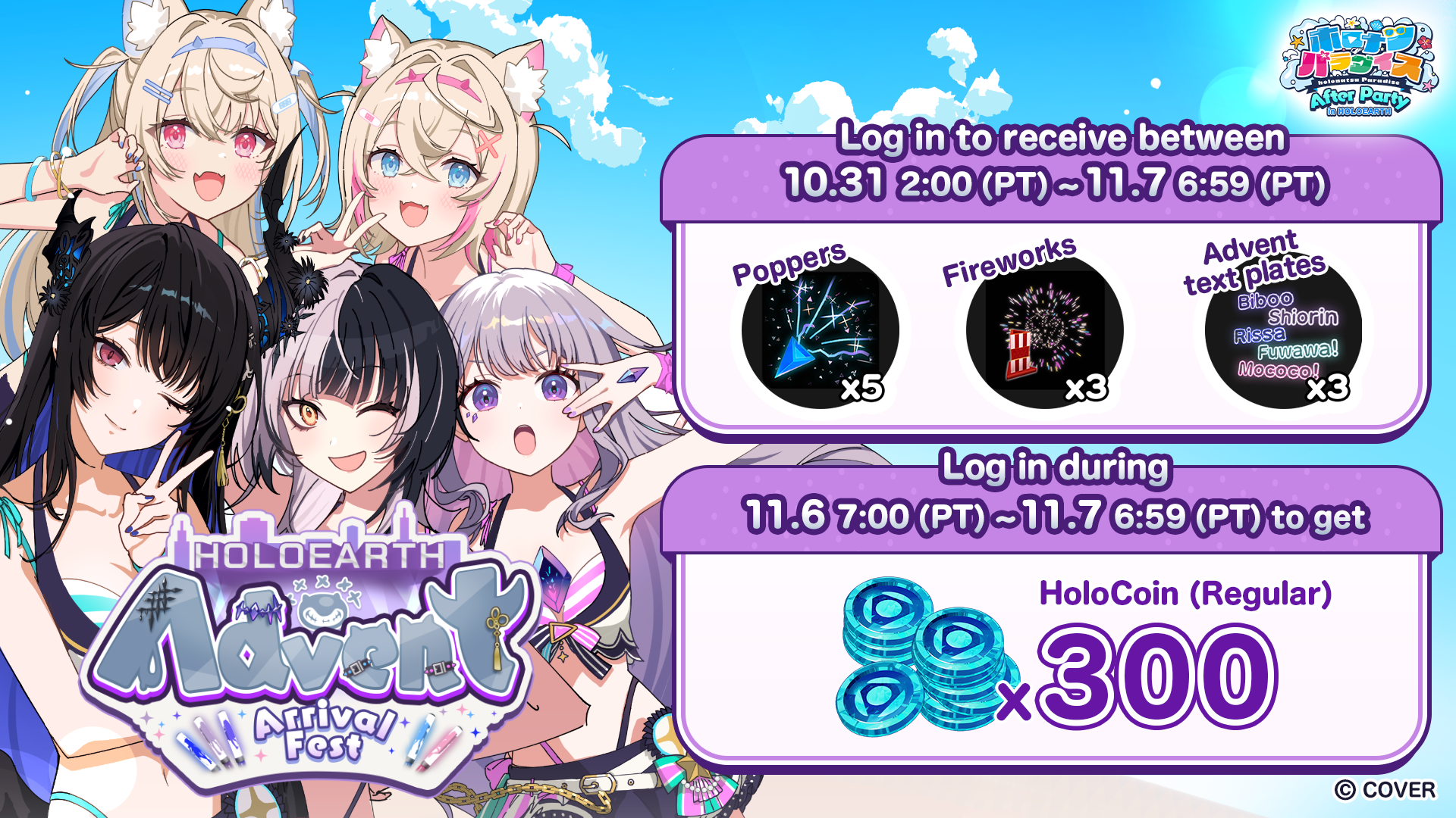From 18:00 (PT) on November 6th, 2025 (November 7th from 11:00 (JST)), the members of hololive English -Advent- will come to Holoearth as their very own avatars in a special festival event, “Advent’s Arrival Fest.”