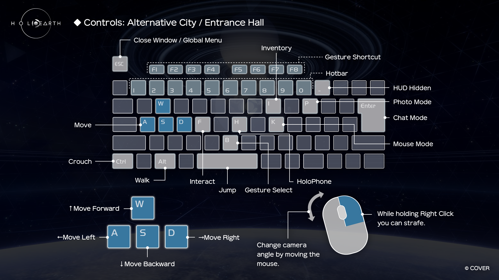 After creating an avatar and entering Holoearth, you can control your avatar using a mouse and keyboard.