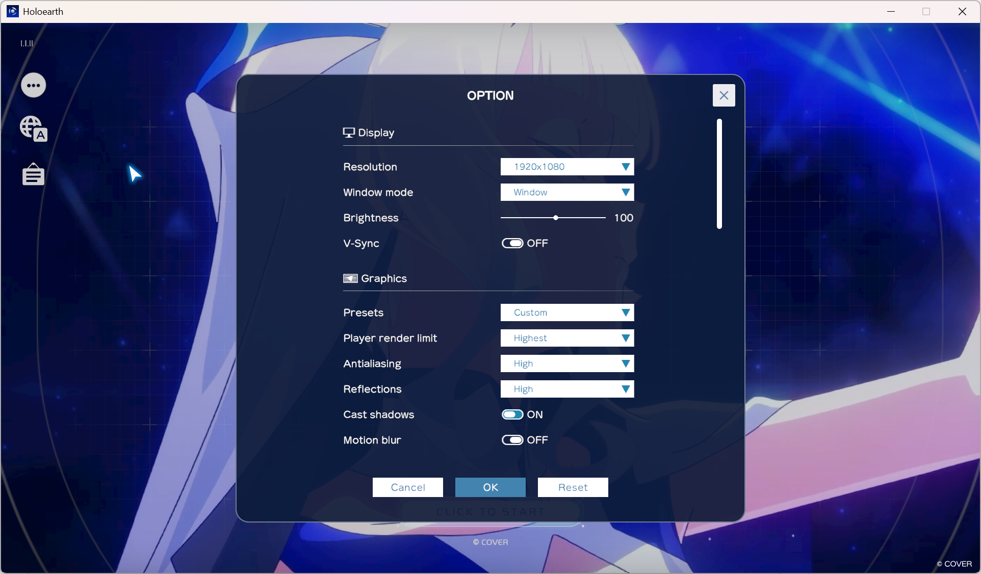 If you still experience issues after starting Holoearth, from the title screen hit Esc for global options and go to Graphics and try lowering the presets. You can also try lowering the detailed graphics settings such as player render limit and reflections.