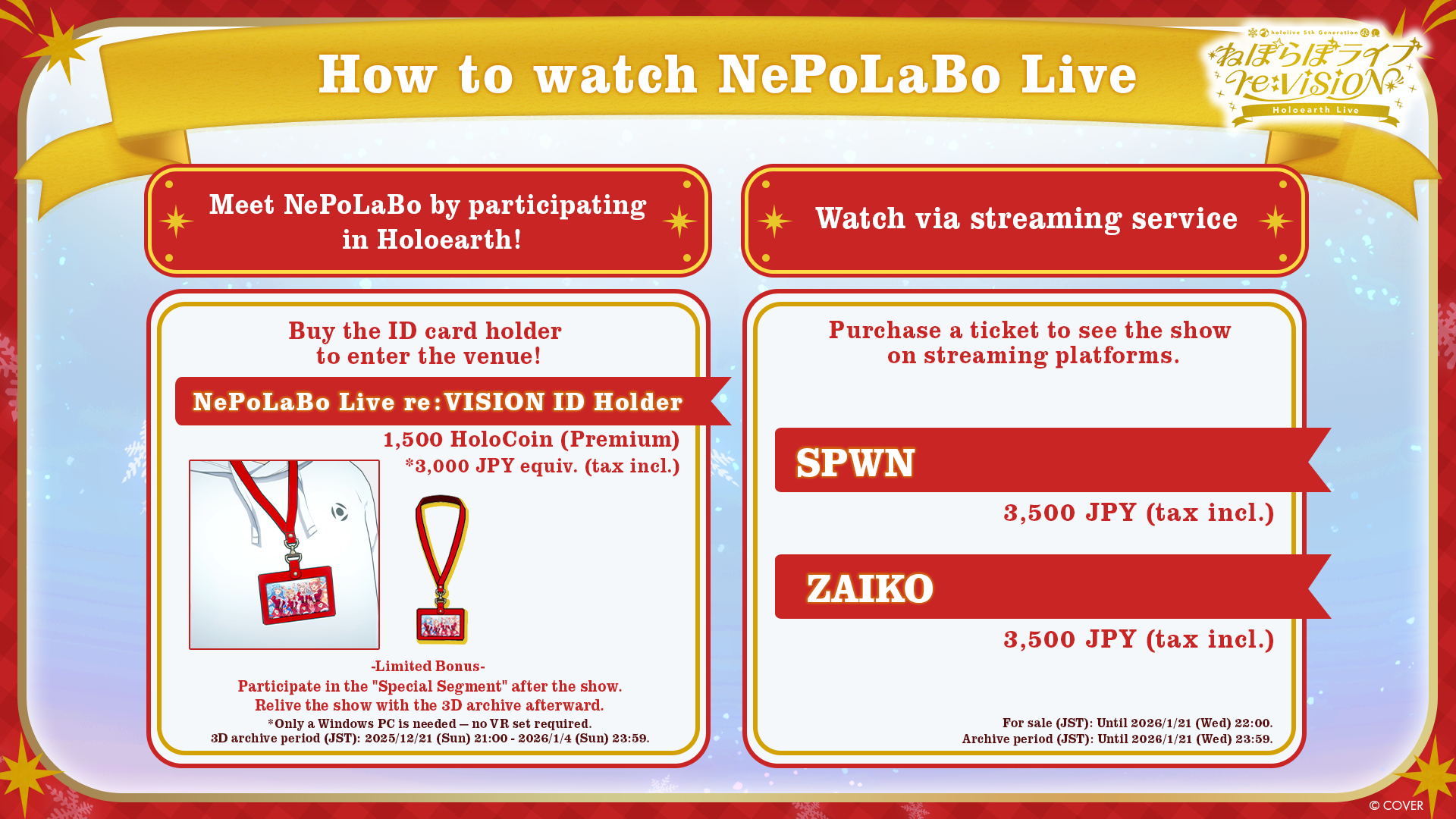 It is necessary to purchase the in-app “NePoLaBo Live re:VISION ID Holder” in order to participate in NePoLaBo Live.