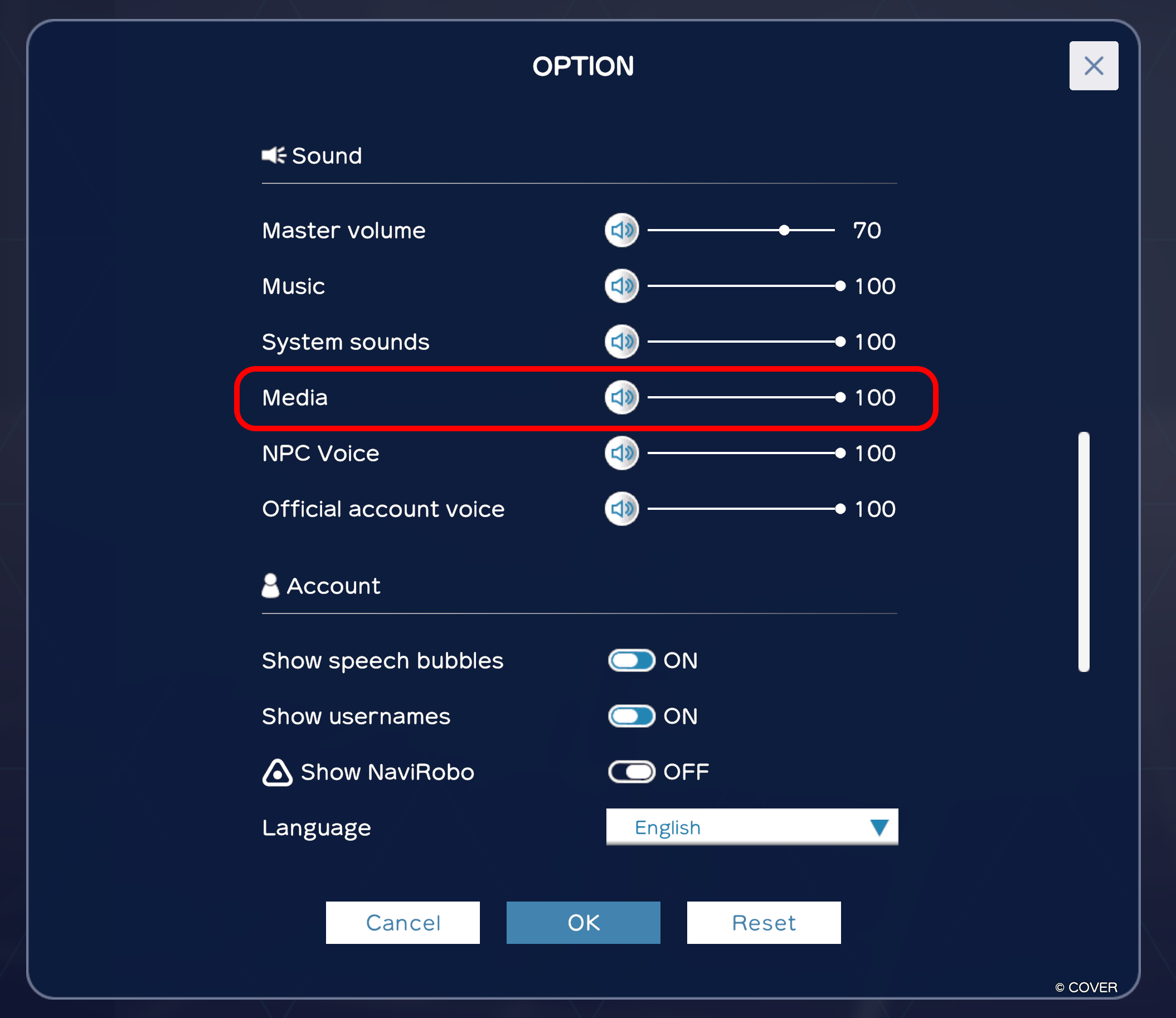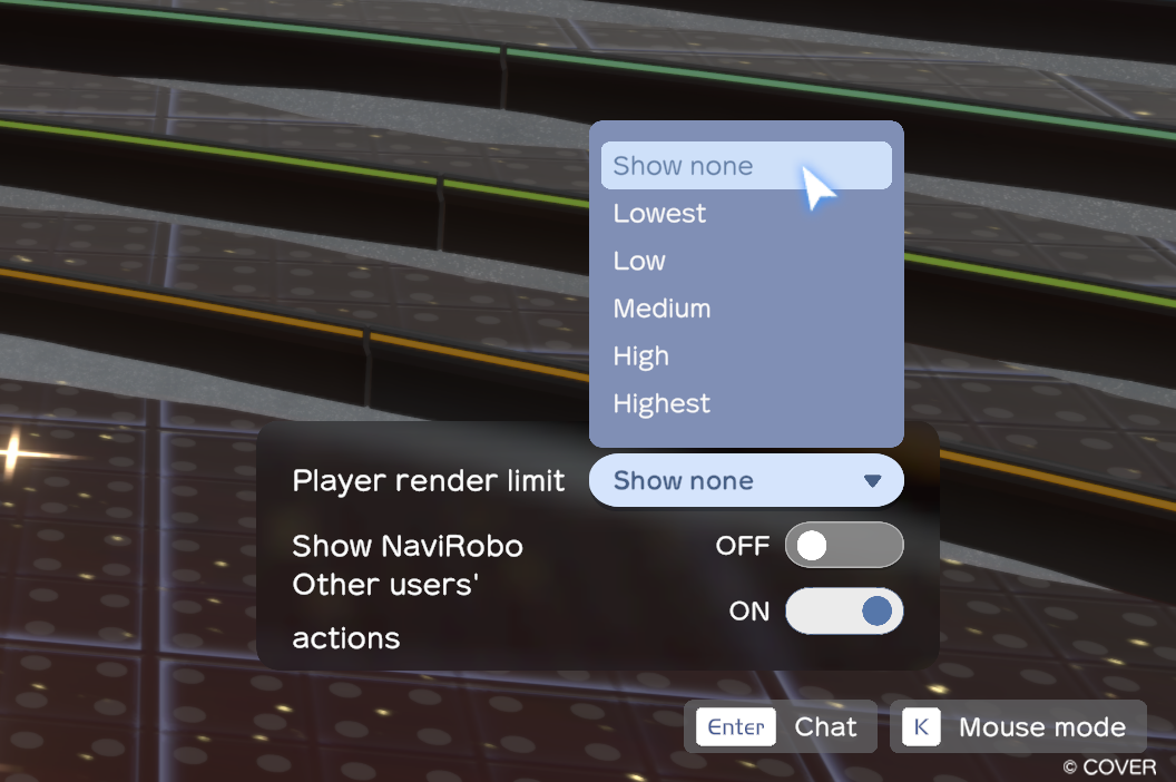 Here, you can toggle features like “NaviRobo Display,” “Other Users’ Actions” (such as poppers or fireworks), and adjust the number of player models rendered in the area.