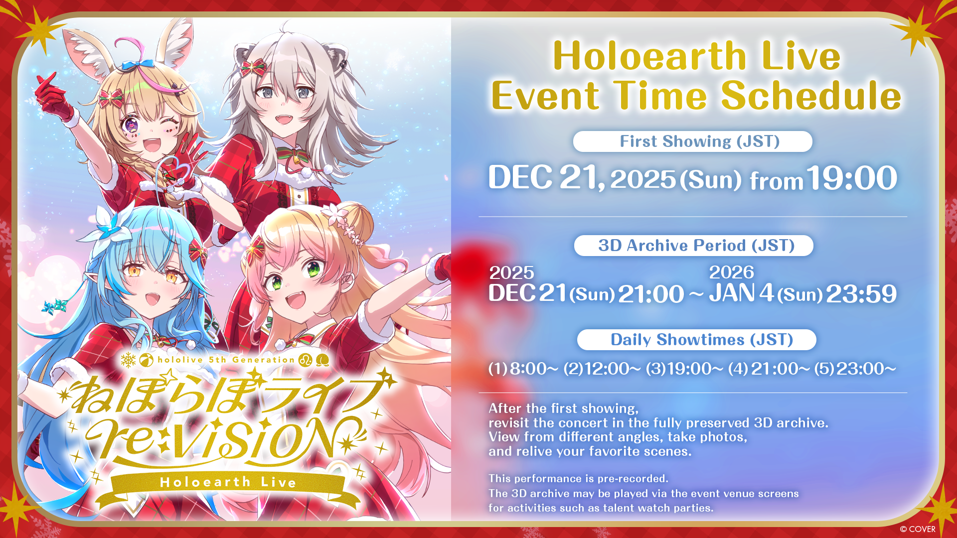 On December 21, 2025 (JST) members of hololive 5th Generation (Momosuzu Nene / Omaru Polka / Yukihana Lamy / Shishiro Botan) will hold a special virtual concert: “NePoLaBo Live re:VISION Holoearth Live.”