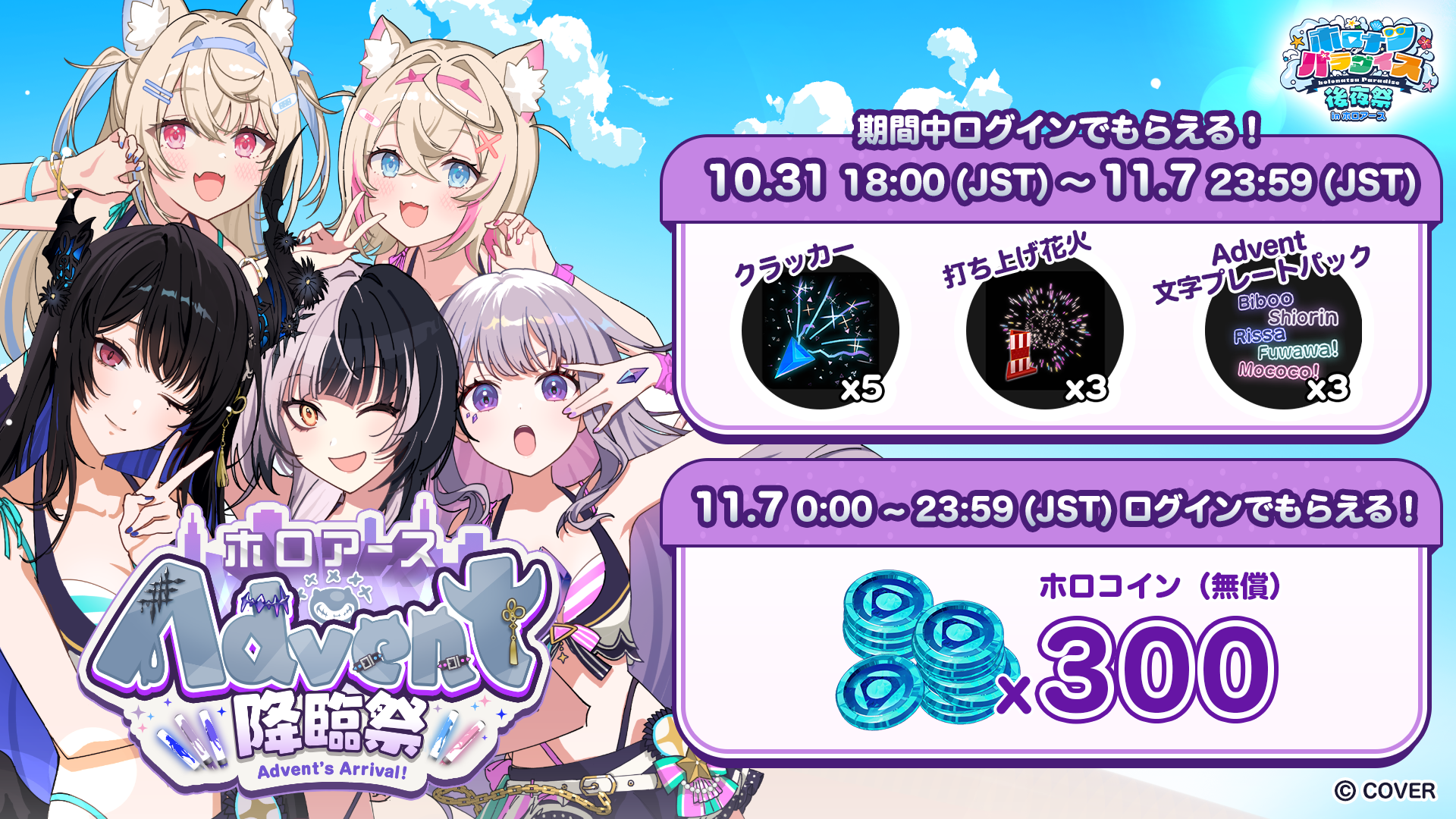 300ホロコインや文字プレートなどが入手できますので、期間中にログインして受け取りましょう!