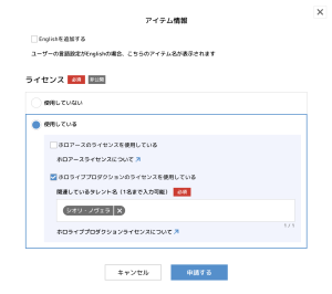 ②Adventメンバーのラインセンスを使用している場合は、アイテム審査申請時、ライセンス欄に該当メンバーの名前を入力する。