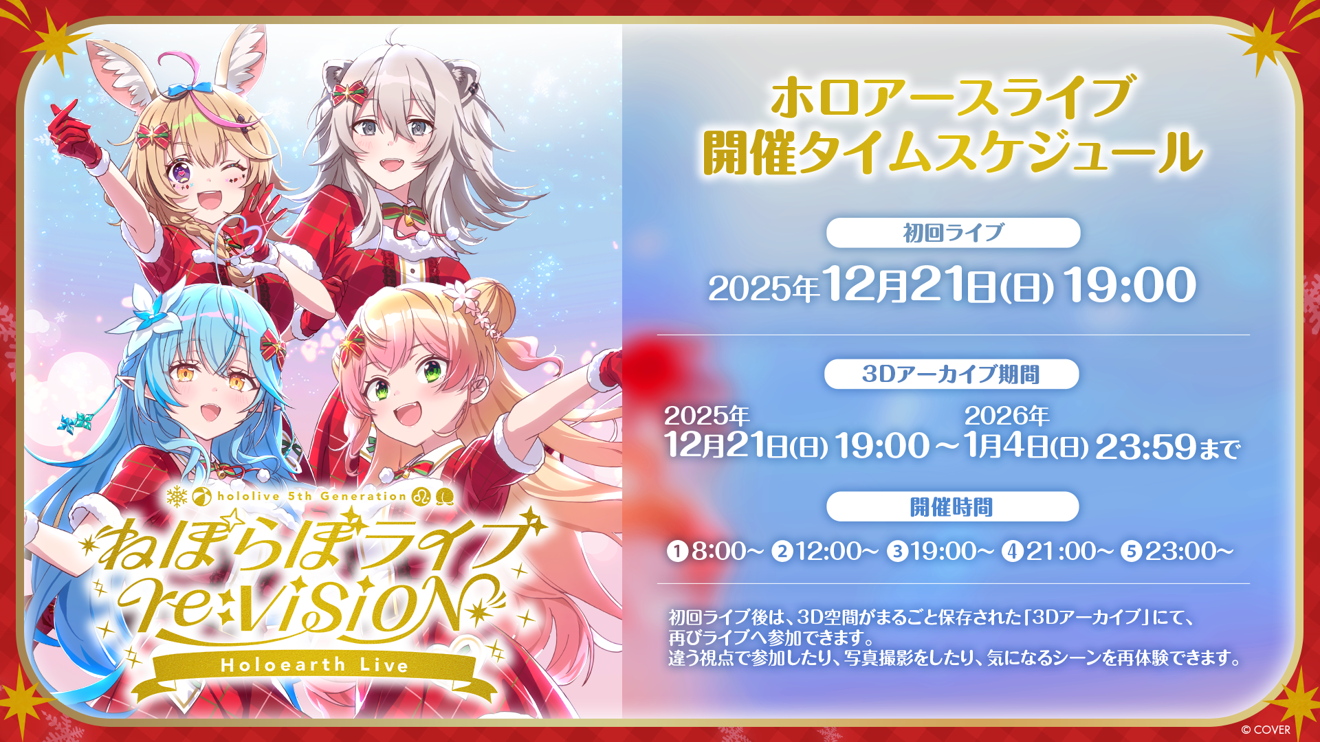 2025年12月21日(日)ホロアースにて、ホロライブ5期生「ねぽらぼ」(桃鈴ねね / 尾丸ポルカ / 雪花ラミィ / 獅白ぼたん)が出演する、バーチャルライブ「ねぽらぼライブ re:VISION Holoearth Live」の開催が決定しました。
