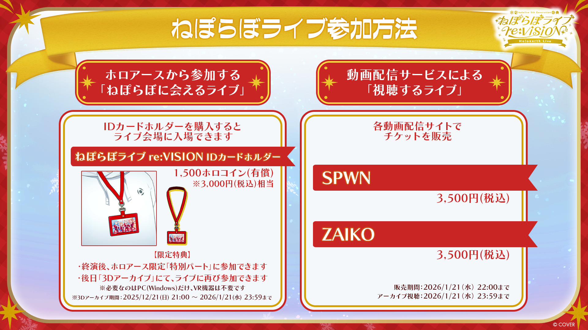 ホロアースライブに参加するには、Windows PCでホロアースのインストールとアカウント作成、ホロアース内のアイテム「ねぽらぼライブ re:VISION IDカードホルダー」のご購入が必要です。