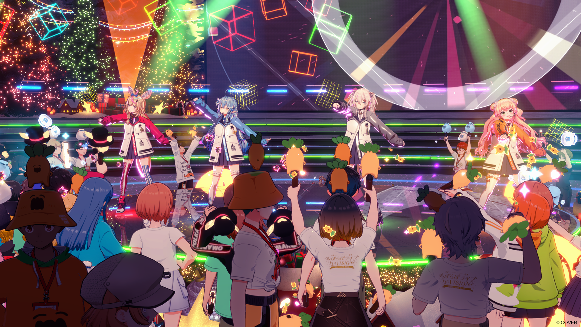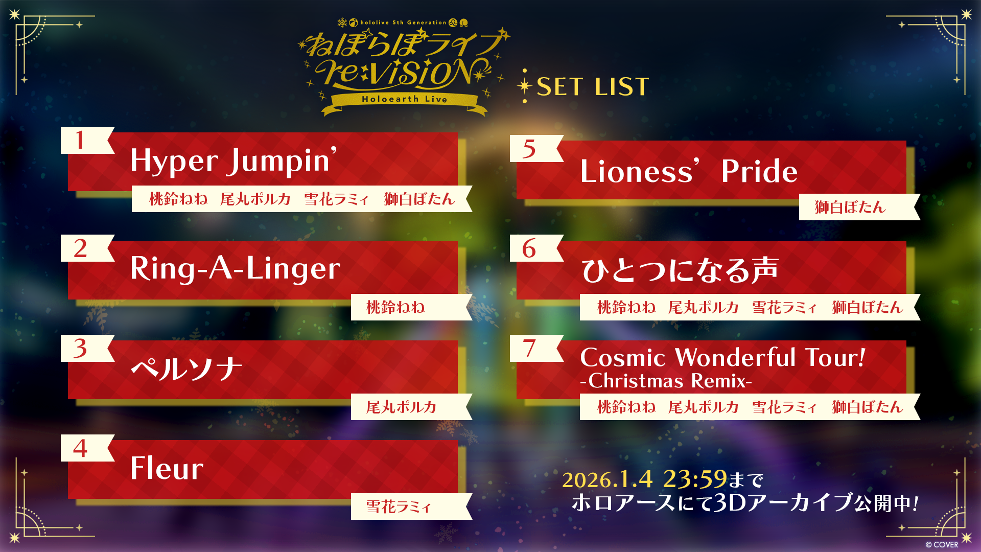 2025年12月21日(日)ホロアースにて、ホロライブ5期生「ねぽらぼ」(桃鈴ねね / 尾丸ポルカ / 雪花ラミィ / 獅白ぼたん)が出演する、バーチャルライブ「ねぽらぼライブ re:VISION Holoearth Live」が開催されました。