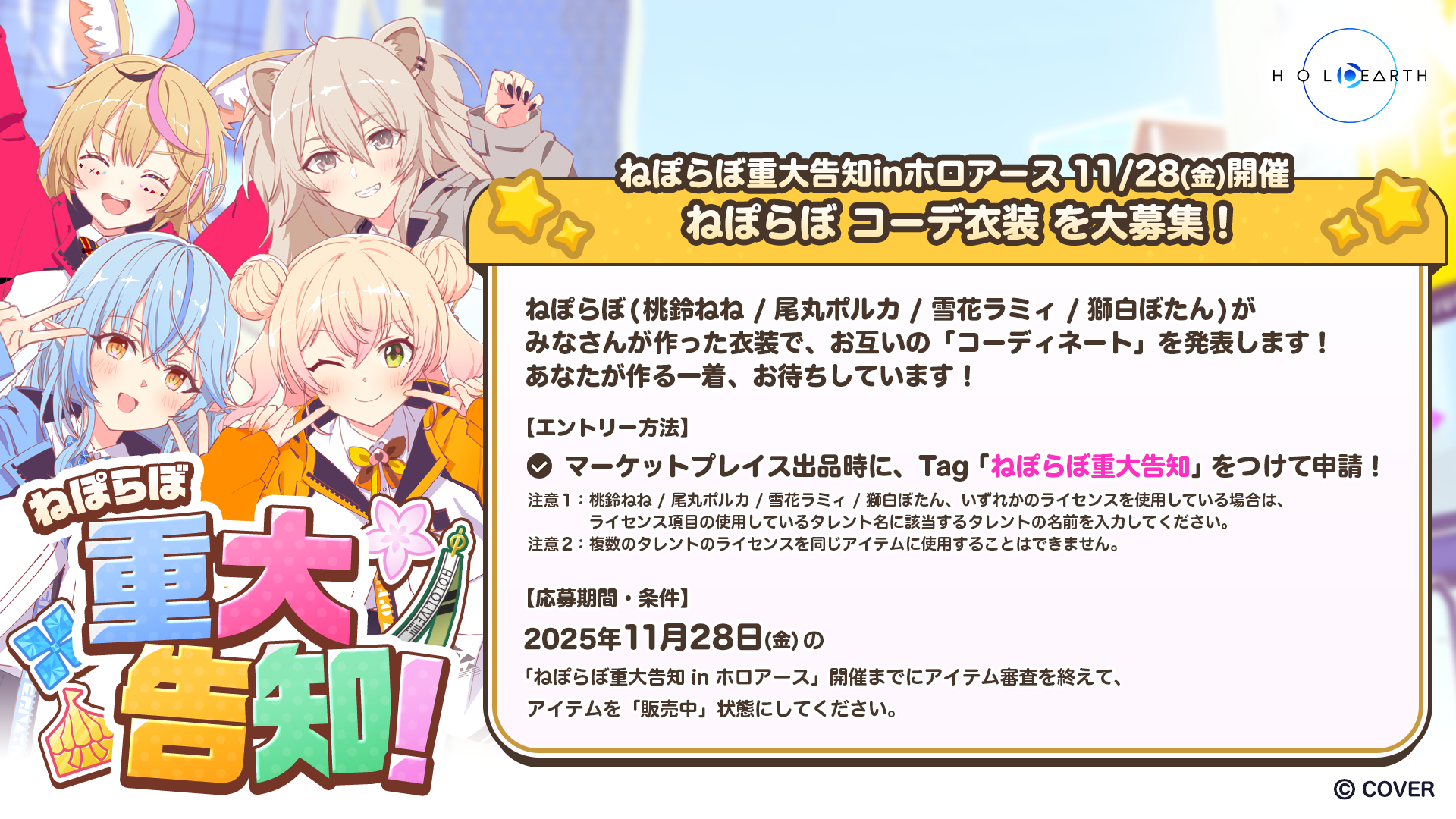 11月28日開催「ねぽらぼ重大告知 in ホロアース」では、ねぽらぼ(桃鈴ねね / 尾丸ポルカ / 雪花ラミィ / 獅白ぼたん)が、みなさんが作った衣装で、お互いの「コーディネート」を発表します。