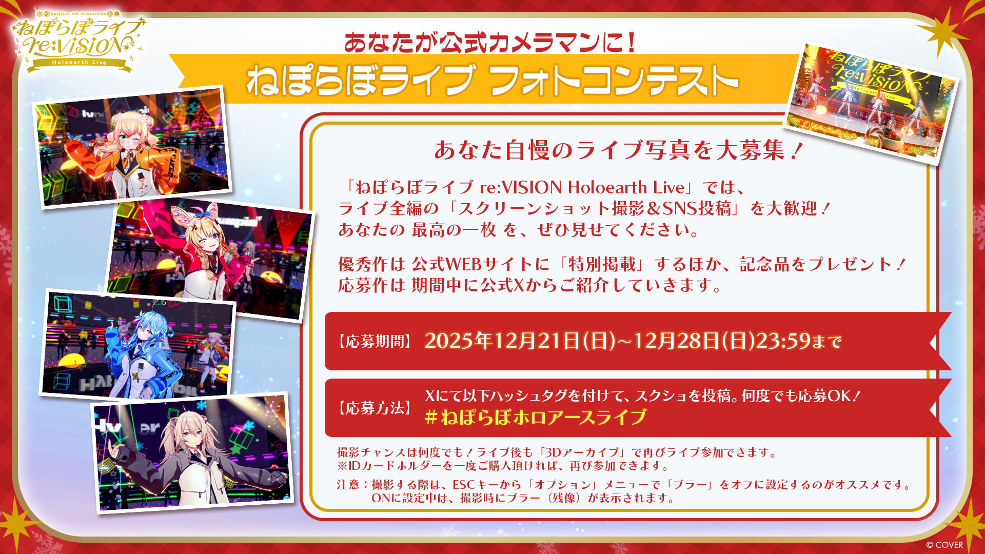 2025年12月21日(日)ホロアースにて開催されるバーチャルライブ「ねぽらぼライブ re:VISION Holoearth Live」のフォトコンテストを開催します。